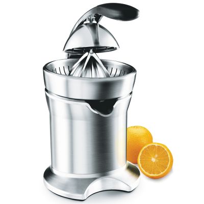 Unlike lesser citrus presses with static reamers and levers that require laborious manual efforts, this advanced unit has a patented mechanical arm that lowers with minimal force and a powered, four-fin reamer that extracts optimal fresh juice from any kind of citrus, regardless of size. Simply place half of a citrus fruit on the reamer and lower the double-hinged mechanical arm. The arm's domed press centers the fruit on the reamer and, as pressure is applied to the reamer, it automatically begins to spin. The reamer's specially designed multi-tiered fins extract juice and pulp without removing the bitter pith. The unit comes with two interchangeable stainless steel filters (one with fine perforations and another with wide slots) that remove seeds yet allow you to determine the amount of pulp in your juice. The stainless steel reamer, juice collector, and spout resist citrus acidity and the housing is made from chrome plated diecast aluminum, ensuring years of durable use. With a soft-grip handle and a spout that raises to prevent dripping between uses. The reamer, filters, spout, and domed press remove and are dishwasher safe. Stainless steel housing wipes clean. Plugs into AC. 17" H x 13" W x 8 1/2" D. (19 lbs.)