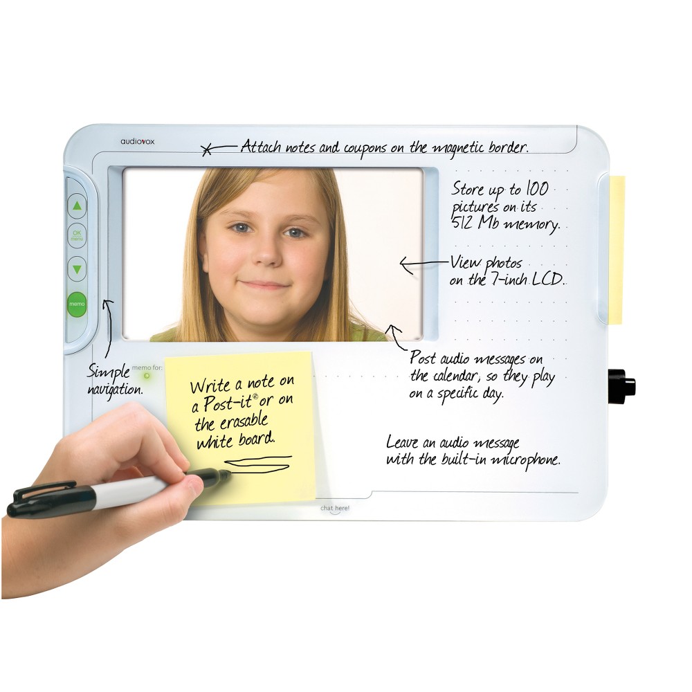 Perfect for mounting on the outside of the fridge door! Set in on the counter or mount on wall. Audiovox makes it unique, convenient and fun. With the audio home base message center you can leave short audio notes via the built-in mic for the kids, leave a post-it note, or write on an erasable white board. It also stores up to 125 photos of your favorite people and places. AC powered. AC cord included.